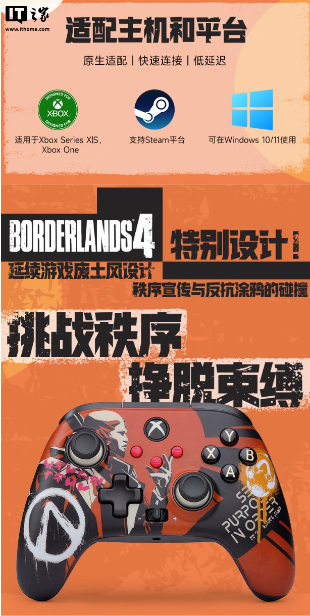 自带 4 颗自定义背键、593.29 元:PowerA 推出《无主之地 4》联名 Xbox 手柄